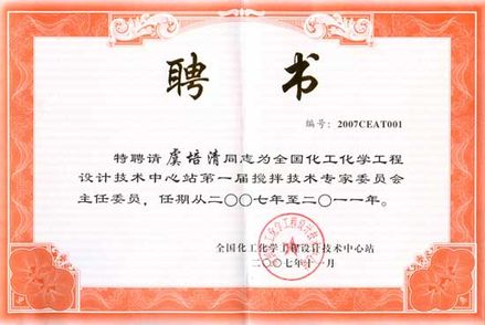虞培清總經(jīng)理:全國(guó)化工化學(xué)工程設(shè)計(jì)技術(shù)中心站攪拌技術(shù)專家委員會(huì)主任委員聘書