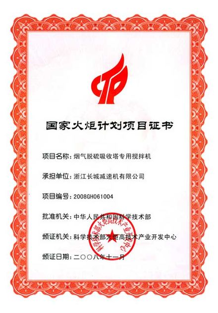 “煙氣脫硫吸收塔專用攪拌機”國家火炬計劃項目證書